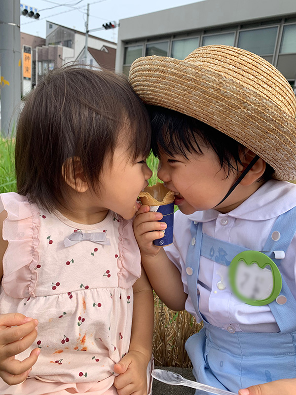 コロナ禍で保育園の行事で楽しみだった遠足が中止になったため子供たちは初めての宮島へ行った時に撮ったベストショットです。