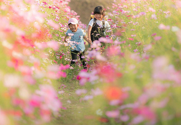 コスモス畑にて、秘密の抜け道みたいな小さな小径を見つけた子供たち。