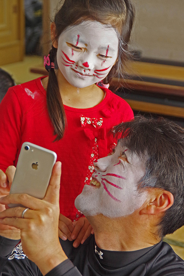 お兄ちゃんの顔がいつもと違うので、不思議そうな顔押していました。